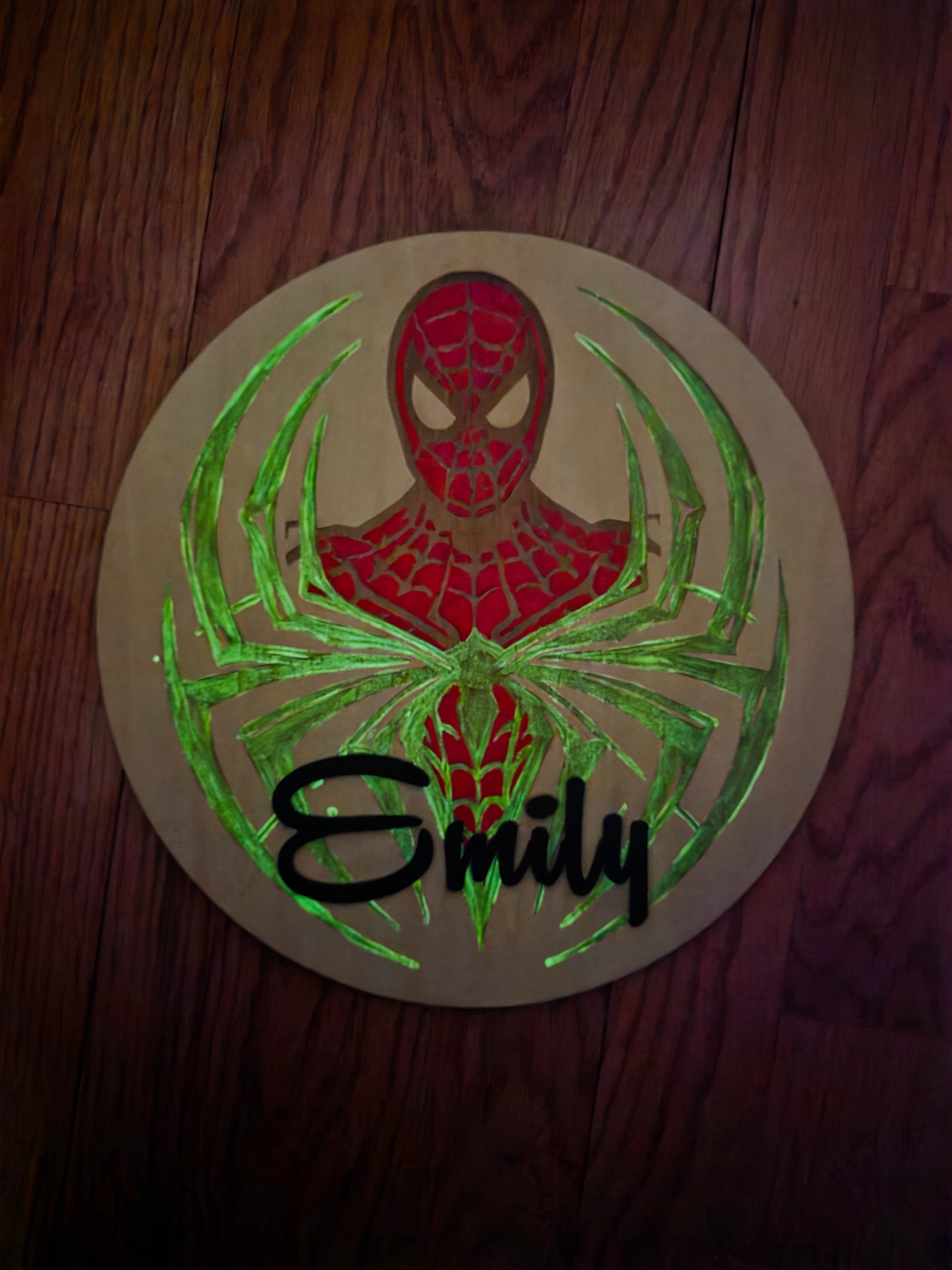 Engraved superhero on circle wood with personalized name. The spider glows in the dark
